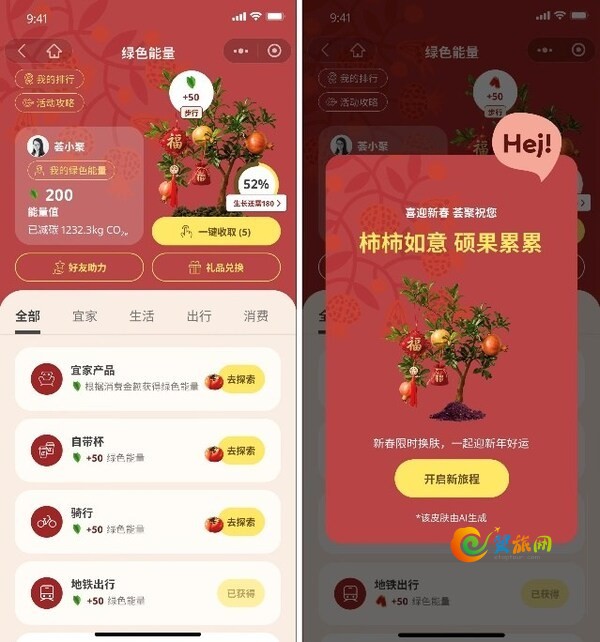 除了新春时节丰富多彩的非遗民俗线下体验,英格卡购物中心还为近600万荟聚会员匠心提供了一系列多元的礼品选择和专属活动,巧妙融合线上线下,带来别具一格、趣味盎然的聚会场景。在1月16日至2月16日期间,无锡、北京、武汉、长沙和西安5地荟聚会员小程序中的绿色能量板块焕新了”柿柿如意”的新春限定皮肤,以更便捷的绿色消费体验和低碳生活方式助力消费者打卡可持续相关活动,轻松收集绿色能量,让更多人在和家人朋友团圆欢聚的同时,不忘继续为共享的地球家园带来满满的绿色能量。
