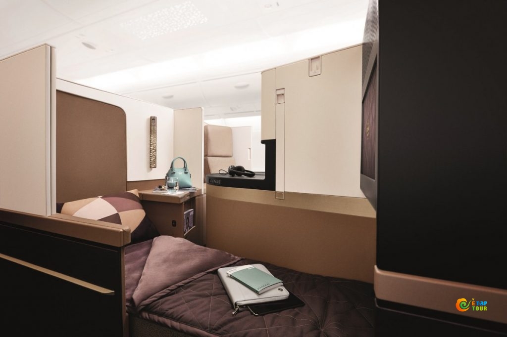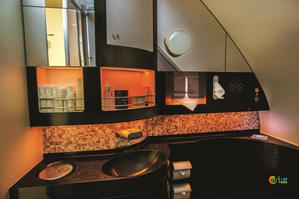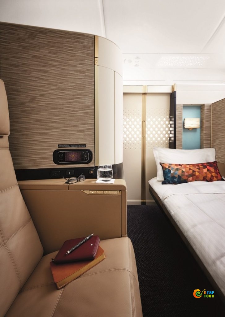 九个公寓头等舱提供了完全私密的起居空间,并配有Poltrona Frau皮质铺面的大型沙发、可变为全尺寸睡床的独立软垫椅、平板电视、小冰柜、私人梳化台和衣橱,以及专供头等舱乘客使用、设备齐全的浴室等。头等舱还配有空中大厨,可为乘客营造雅致的进餐体验。